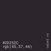 Цвет #2D252C в цветовой модели RGB обозначается тремя октетами (45, 37, 44) в десятичном формате и #2D252C в шестнадцатиричном (hex) формате, которые являются интенсивностью красного 45 (hex 2D), интенсивность зелёного 37 (hex 25) и интенсивность синего 44 (hex 2C).