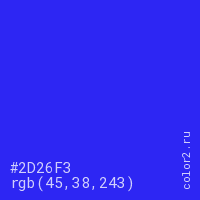 Цвет #2D26F3 в цветовой модели RGB обозначается тремя октетами (45, 38, 243) в десятичном формате и #2D26F3 в шестнадцатиричном (hex) формате, которые являются интенсивностью красного 45 (hex 2D), интенсивность зелёного 38 (hex 26) и интенсивность синего 243 (hex F3).