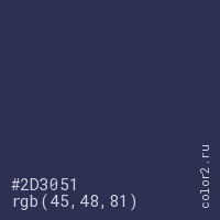 Цвет #2D3051 в цветовой модели RGB обозначается тремя октетами (45, 48, 81) в десятичном формате и #2D3051 в шестнадцатиричном (hex) формате, которые являются интенсивностью красного 45 (hex 2D), интенсивность зелёного 48 (hex 30) и интенсивность синего 81 (hex 51).
