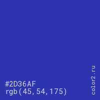 Цвет #2D36AF в цветовой модели RGB обозначается тремя октетами (45, 54, 175) в десятичном формате и #2D36AF в шестнадцатиричном (hex) формате, которые являются интенсивностью красного 45 (hex 2D), интенсивность зелёного 54 (hex 36) и интенсивность синего 175 (hex AF).