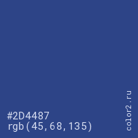 Цвет #2D4487 в цветовой модели RGB обозначается тремя октетами (45, 68, 135) в десятичном формате и #2D4487 в шестнадцатиричном (hex) формате, которые являются интенсивностью красного 45 (hex 2D), интенсивность зелёного 68 (hex 44) и интенсивность синего 135 (hex 87).