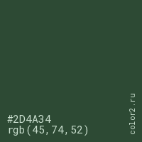 Цвет #2D4A34 в цветовой модели RGB обозначается тремя октетами (45, 74, 52) в десятичном формате и #2D4A34 в шестнадцатиричном (hex) формате, которые являются интенсивностью красного 45 (hex 2D), интенсивность зелёного 74 (hex 4A) и интенсивность синего 52 (hex 34).