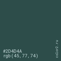 Цвет #2D4D4A в цветовой модели RGB обозначается тремя октетами (45, 77, 74) в десятичном формате и #2D4D4A в шестнадцатиричном (hex) формате, которые являются интенсивностью красного 45 (hex 2D), интенсивность зелёного 77 (hex 4D) и интенсивность синего 74 (hex 4A).