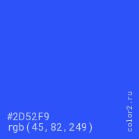 Цвет #2D52F9 в цветовой модели RGB обозначается тремя октетами (45, 82, 249) в десятичном формате и #2D52F9 в шестнадцатиричном (hex) формате, которые являются интенсивностью красного 45 (hex 2D), интенсивность зелёного 82 (hex 52) и интенсивность синего 249 (hex F9).