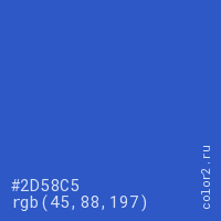 Цвет #2D58C5 в цветовой модели RGB обозначается тремя октетами (45, 88, 197) в десятичном формате и #2D58C5 в шестнадцатиричном (hex) формате, которые являются интенсивностью красного 45 (hex 2D), интенсивность зелёного 88 (hex 58) и интенсивность синего 197 (hex C5).