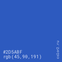 Цвет #2D5ABF в цветовой модели RGB обозначается тремя октетами (45, 90, 191) в десятичном формате и #2D5ABF в шестнадцатиричном (hex) формате, которые являются интенсивностью красного 45 (hex 2D), интенсивность зелёного 90 (hex 5A) и интенсивность синего 191 (hex BF).
