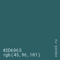 Цвет #2D6065 в цветовой модели RGB обозначается тремя октетами (45, 96, 101) в десятичном формате и #2D6065 в шестнадцатиричном (hex) формате, которые являются интенсивностью красного 45 (hex 2D), интенсивность зелёного 96 (hex 60) и интенсивность синего 101 (hex 65).