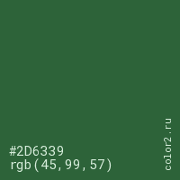 Цвет #2D6339 в цветовой модели RGB обозначается тремя октетами (45, 99, 57) в десятичном формате и #2D6339 в шестнадцатиричном (hex) формате, которые являются интенсивностью красного 45 (hex 2D), интенсивность зелёного 99 (hex 63) и интенсивность синего 57 (hex 39).