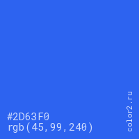 Цвет #2D63F0 в цветовой модели RGB обозначается тремя октетами (45, 99, 240) в десятичном формате и #2D63F0 в шестнадцатиричном (hex) формате, которые являются интенсивностью красного 45 (hex 2D), интенсивность зелёного 99 (hex 63) и интенсивность синего 240 (hex F0).