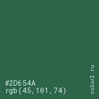 Цвет #2D654A в цветовой модели RGB обозначается тремя октетами (45, 101, 74) в десятичном формате и #2D654A в шестнадцатиричном (hex) формате, которые являются интенсивностью красного 45 (hex 2D), интенсивность зелёного 101 (hex 65) и интенсивность синего 74 (hex 4A).