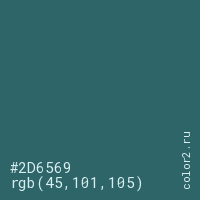 Цвет #2D6569 в цветовой модели RGB обозначается тремя октетами (45, 101, 105) в десятичном формате и #2D6569 в шестнадцатиричном (hex) формате, которые являются интенсивностью красного 45 (hex 2D), интенсивность зелёного 101 (hex 65) и интенсивность синего 105 (hex 69).