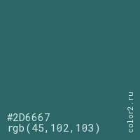 Цвет #2D6667 в цветовой модели RGB обозначается тремя октетами (45, 102, 103) в десятичном формате и #2D6667 в шестнадцатиричном (hex) формате, которые являются интенсивностью красного 45 (hex 2D), интенсивность зелёного 102 (hex 66) и интенсивность синего 103 (hex 67).