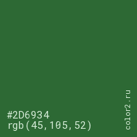 Цвет #2D6934 в цветовой модели RGB обозначается тремя октетами (45, 105, 52) в десятичном формате и #2D6934 в шестнадцатиричном (hex) формате, которые являются интенсивностью красного 45 (hex 2D), интенсивность зелёного 105 (hex 69) и интенсивность синего 52 (hex 34).