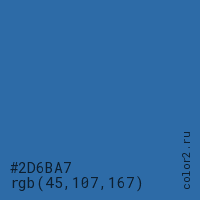 Цвет #2D6BA7 в цветовой модели RGB обозначается тремя октетами (45, 107, 167) в десятичном формате и #2D6BA7 в шестнадцатиричном (hex) формате, которые являются интенсивностью красного 45 (hex 2D), интенсивность зелёного 107 (hex 6B) и интенсивность синего 167 (hex A7).