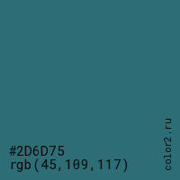 Цвет #2D6D75 в цветовой модели RGB обозначается тремя октетами (45, 109, 117) в десятичном формате и #2D6D75 в шестнадцатиричном (hex) формате, которые являются интенсивностью красного 45 (hex 2D), интенсивность зелёного 109 (hex 6D) и интенсивность синего 117 (hex 75).