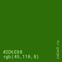Цвет #2D6E08 в цветовой модели RGB обозначается тремя октетами (45, 110, 8) в десятичном формате и #2D6E08 в шестнадцатиричном (hex) формате, которые являются интенсивностью красного 45 (hex 2D), интенсивность зелёного 110 (hex 6E) и интенсивность синего 8 (hex 08).