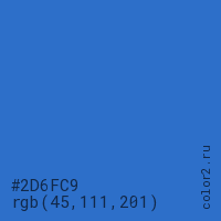 Цвет #2D6FC9 в цветовой модели RGB обозначается тремя октетами (45, 111, 201) в десятичном формате и #2D6FC9 в шестнадцатиричном (hex) формате, которые являются интенсивностью красного 45 (hex 2D), интенсивность зелёного 111 (hex 6F) и интенсивность синего 201 (hex C9).