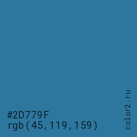 Цвет #2D779F в цветовой модели RGB обозначается тремя октетами (45, 119, 159) в десятичном формате и #2D779F в шестнадцатиричном (hex) формате, которые являются интенсивностью красного 45 (hex 2D), интенсивность зелёного 119 (hex 77) и интенсивность синего 159 (hex 9F).