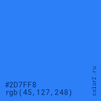Цвет #2D7FF8 в цветовой модели RGB обозначается тремя октетами (45, 127, 248) в десятичном формате и #2D7FF8 в шестнадцатиричном (hex) формате, которые являются интенсивностью красного 45 (hex 2D), интенсивность зелёного 127 (hex 7F) и интенсивность синего 248 (hex F8).