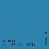 Цвет #2D83AE в цветовой модели RGB обозначается тремя октетами (45, 131, 174) в десятичном формате и #2D83AE в шестнадцатиричном (hex) формате, которые являются интенсивностью красного 45 (hex 2D), интенсивность зелёного 131 (hex 83) и интенсивность синего 174 (hex AE).