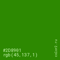Цвет #2D8901 в цветовой модели RGB обозначается тремя октетами (45, 137, 1) в десятичном формате и #2D8901 в шестнадцатиричном (hex) формате, которые являются интенсивностью красного 45 (hex 2D), интенсивность зелёного 137 (hex 89) и интенсивность синего 1 (hex 01).