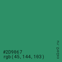 Цвет #2D9067 в цветовой модели RGB обозначается тремя октетами (45, 144, 103) в десятичном формате и #2D9067 в шестнадцатиричном (hex) формате, которые являются интенсивностью красного 45 (hex 2D), интенсивность зелёного 144 (hex 90) и интенсивность синего 103 (hex 67).