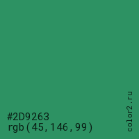 Цвет #2D9263 в цветовой модели RGB обозначается тремя октетами (45, 146, 99) в десятичном формате и #2D9263 в шестнадцатиричном (hex) формате, которые являются интенсивностью красного 45 (hex 2D), интенсивность зелёного 146 (hex 92) и интенсивность синего 99 (hex 63).