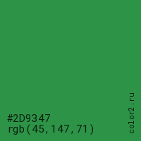 Цвет #2D9347 в цветовой модели RGB обозначается тремя октетами (45, 147, 71) в десятичном формате и #2D9347 в шестнадцатиричном (hex) формате, которые являются интенсивностью красного 45 (hex 2D), интенсивность зелёного 147 (hex 93) и интенсивность синего 71 (hex 47).