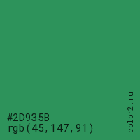 Цвет #2D935B в цветовой модели RGB обозначается тремя октетами (45, 147, 91) в десятичном формате и #2D935B в шестнадцатиричном (hex) формате, которые являются интенсивностью красного 45 (hex 2D), интенсивность зелёного 147 (hex 93) и интенсивность синего 91 (hex 5B).