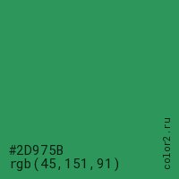 Цвет #2D975B в цветовой модели RGB обозначается тремя октетами (45, 151, 91) в десятичном формате и #2D975B в шестнадцатиричном (hex) формате, которые являются интенсивностью красного 45 (hex 2D), интенсивность зелёного 151 (hex 97) и интенсивность синего 91 (hex 5B).