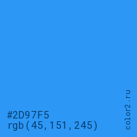 Цвет #2D97F5 в цветовой модели RGB обозначается тремя октетами (45, 151, 245) в десятичном формате и #2D97F5 в шестнадцатиричном (hex) формате, которые являются интенсивностью красного 45 (hex 2D), интенсивность зелёного 151 (hex 97) и интенсивность синего 245 (hex F5).