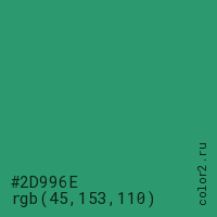 Цвет #2D996E в цветовой модели RGB обозначается тремя октетами (45, 153, 110) в десятичном формате и #2D996E в шестнадцатиричном (hex) формате, которые являются интенсивностью красного 45 (hex 2D), интенсивность зелёного 153 (hex 99) и интенсивность синего 110 (hex 6E).