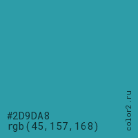 Цвет #2D9DA8 в цветовой модели RGB обозначается тремя октетами (45, 157, 168) в десятичном формате и #2D9DA8 в шестнадцатиричном (hex) формате, которые являются интенсивностью красного 45 (hex 2D), интенсивность зелёного 157 (hex 9D) и интенсивность синего 168 (hex A8).