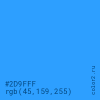 Цвет #2D9FFF в цветовой модели RGB обозначается тремя октетами (45, 159, 255) в десятичном формате и #2D9FFF в шестнадцатиричном (hex) формате, которые являются интенсивностью красного 45 (hex 2D), интенсивность зелёного 159 (hex 9F) и интенсивность синего 255 (hex FF).