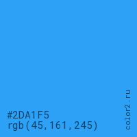 Цвет #2DA1F5 в цветовой модели RGB обозначается тремя октетами (45, 161, 245) в десятичном формате и #2DA1F5 в шестнадцатиричном (hex) формате, которые являются интенсивностью красного 45 (hex 2D), интенсивность зелёного 161 (hex A1) и интенсивность синего 245 (hex F5).