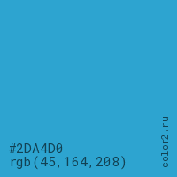 Цвет #2DA4D0 в цветовой модели RGB обозначается тремя октетами (45, 164, 208) в десятичном формате и #2DA4D0 в шестнадцатиричном (hex) формате, которые являются интенсивностью красного 45 (hex 2D), интенсивность зелёного 164 (hex A4) и интенсивность синего 208 (hex D0).