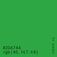 Цвет #2DA744 в цветовой модели RGB обозначается тремя октетами (45, 167, 68) в десятичном формате и #2DA744 в шестнадцатиричном (hex) формате, которые являются интенсивностью красного 45 (hex 2D), интенсивность зелёного 167 (hex A7) и интенсивность синего 68 (hex 44).