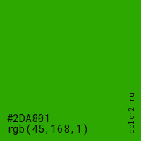 Цвет #2DA801 в цветовой модели RGB обозначается тремя октетами (45, 168, 1) в десятичном формате и #2DA801 в шестнадцатиричном (hex) формате, которые являются интенсивностью красного 45 (hex 2D), интенсивность зелёного 168 (hex A8) и интенсивность синего 1 (hex 01).
