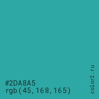 Цвет #2DA8A5 в цветовой модели RGB обозначается тремя октетами (45, 168, 165) в десятичном формате и #2DA8A5 в шестнадцатиричном (hex) формате, которые являются интенсивностью красного 45 (hex 2D), интенсивность зелёного 168 (hex A8) и интенсивность синего 165 (hex A5).