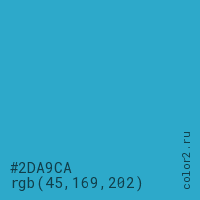 Цвет #2DA9CA в цветовой модели RGB обозначается тремя октетами (45, 169, 202) в десятичном формате и #2DA9CA в шестнадцатиричном (hex) формате, которые являются интенсивностью красного 45 (hex 2D), интенсивность зелёного 169 (hex A9) и интенсивность синего 202 (hex CA).