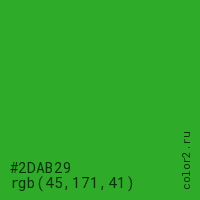 Цвет #2DAB29 в цветовой модели RGB обозначается тремя октетами (45, 171, 41) в десятичном формате и #2DAB29 в шестнадцатиричном (hex) формате, которые являются интенсивностью красного 45 (hex 2D), интенсивность зелёного 171 (hex AB) и интенсивность синего 41 (hex 29).