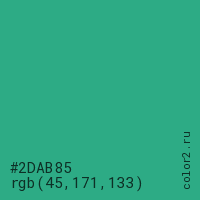Цвет #2DAB85 в цветовой модели RGB обозначается тремя октетами (45, 171, 133) в десятичном формате и #2DAB85 в шестнадцатиричном (hex) формате, которые являются интенсивностью красного 45 (hex 2D), интенсивность зелёного 171 (hex AB) и интенсивность синего 133 (hex 85).
