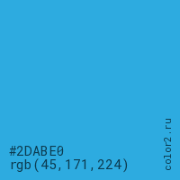 Цвет #2DABE0 в цветовой модели RGB обозначается тремя октетами (45, 171, 224) в десятичном формате и #2DABE0 в шестнадцатиричном (hex) формате, которые являются интенсивностью красного 45 (hex 2D), интенсивность зелёного 171 (hex AB) и интенсивность синего 224 (hex E0).