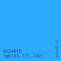 Цвет #2DABFD в цветовой модели RGB обозначается тремя октетами (45, 171, 253) в десятичном формате и #2DABFD в шестнадцатиричном (hex) формате, которые являются интенсивностью красного 45 (hex 2D), интенсивность зелёного 171 (hex AB) и интенсивность синего 253 (hex FD).
