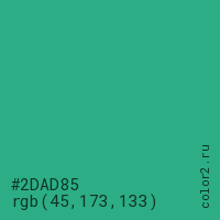 Цвет #2DAD85 в цветовой модели RGB обозначается тремя октетами (45, 173, 133) в десятичном формате и #2DAD85 в шестнадцатиричном (hex) формате, которые являются интенсивностью красного 45 (hex 2D), интенсивность зелёного 173 (hex AD) и интенсивность синего 133 (hex 85).