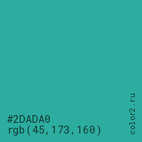 Цвет #2DADA0 в цветовой модели RGB обозначается тремя октетами (45, 173, 160) в десятичном формате и #2DADA0 в шестнадцатиричном (hex) формате, которые являются интенсивностью красного 45 (hex 2D), интенсивность зелёного 173 (hex AD) и интенсивность синего 160 (hex A0).