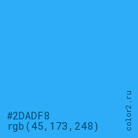 Цвет #2DADF8 в цветовой модели RGB обозначается тремя октетами (45, 173, 248) в десятичном формате и #2DADF8 в шестнадцатиричном (hex) формате, которые являются интенсивностью красного 45 (hex 2D), интенсивность зелёного 173 (hex AD) и интенсивность синего 248 (hex F8).