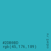 Цвет #2DB0BD в цветовой модели RGB обозначается тремя октетами (45, 176, 189) в десятичном формате и #2DB0BD в шестнадцатиричном (hex) формате, которые являются интенсивностью красного 45 (hex 2D), интенсивность зелёного 176 (hex B0) и интенсивность синего 189 (hex BD).