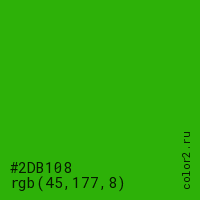 Цвет #2DB108 в цветовой модели RGB обозначается тремя октетами (45, 177, 8) в десятичном формате и #2DB108 в шестнадцатиричном (hex) формате, которые являются интенсивностью красного 45 (hex 2D), интенсивность зелёного 177 (hex B1) и интенсивность синего 8 (hex 08).