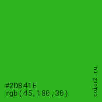 Цвет #2DB41E в цветовой модели RGB обозначается тремя октетами (45, 180, 30) в десятичном формате и #2DB41E в шестнадцатиричном (hex) формате, которые являются интенсивностью красного 45 (hex 2D), интенсивность зелёного 180 (hex B4) и интенсивность синего 30 (hex 1E).